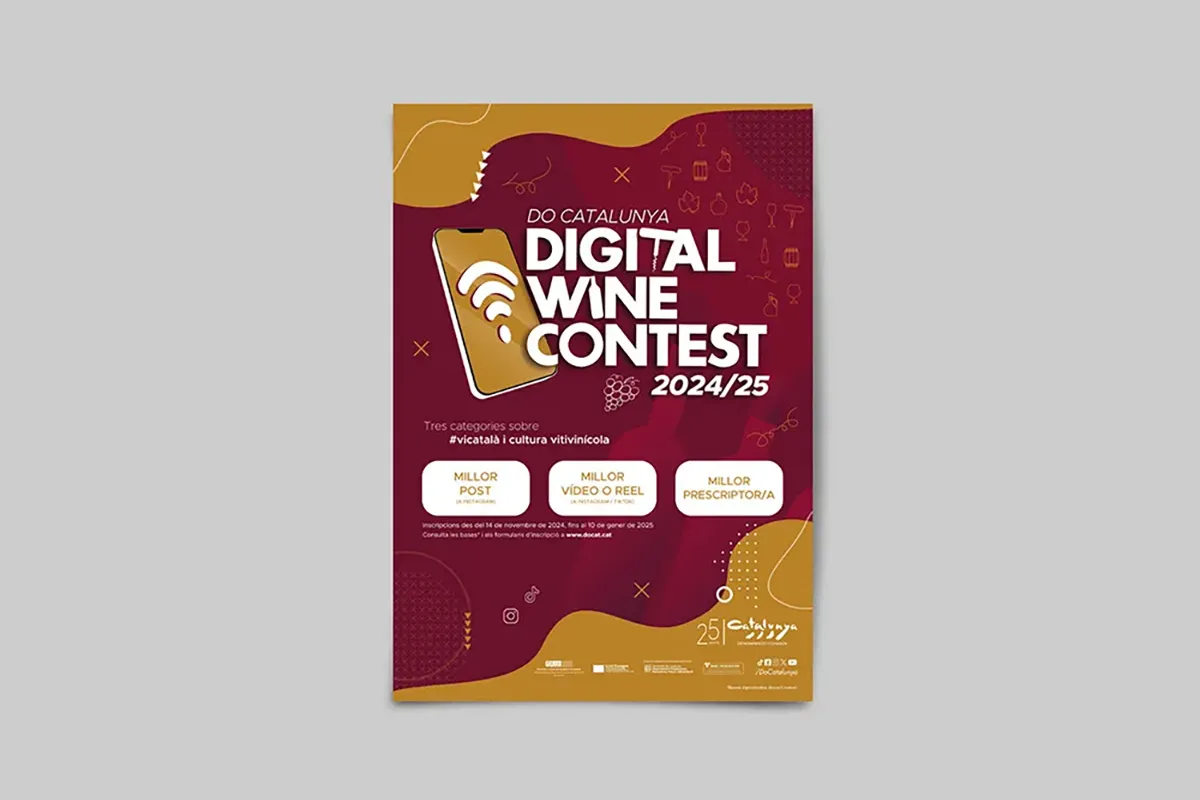 Digital Wine Contest Objetivo: Crear la nueva imagen para la edición 2024-25 del Digital Wine Contest, de la DO Catalunya. Mi rol: Se realiza el diseño del cartel y sus adaptaciones (redes sociales, cubos, tarjetas presentadora, carta de vinos, …) siguiendo el estilo de otras ediciones para continuar con la misma esencia. Agencia: PCATS Comunicació